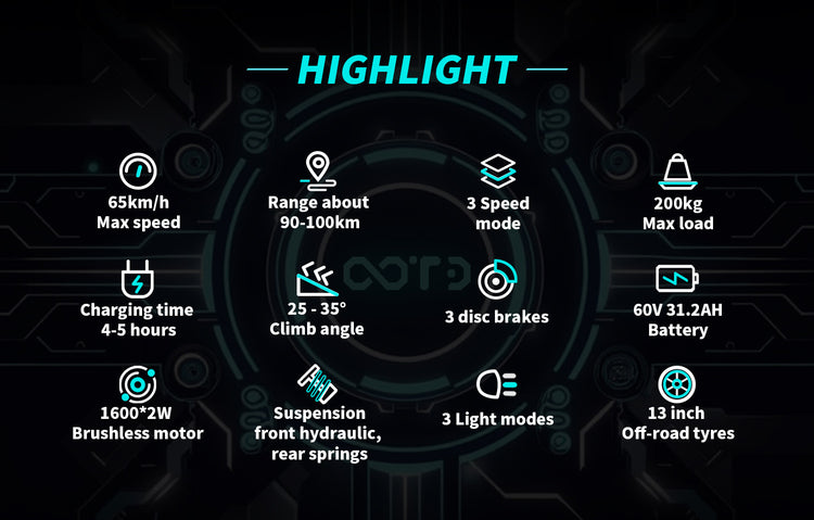 Alimenté par une batterie 60 V 31,2 Ah, le T30 offre une autonomie impressionnante de 80 à 90 km, minimisant les recharges fréquentes et vous offrant la liberté d'explorer. Il prend en charge deux options de charge (60 V 5 A et 60 V 2,5 A), et l'utilisation simultanée de deux chargeurs réduit le temps de charge à seulement 4 à 6 heures.
